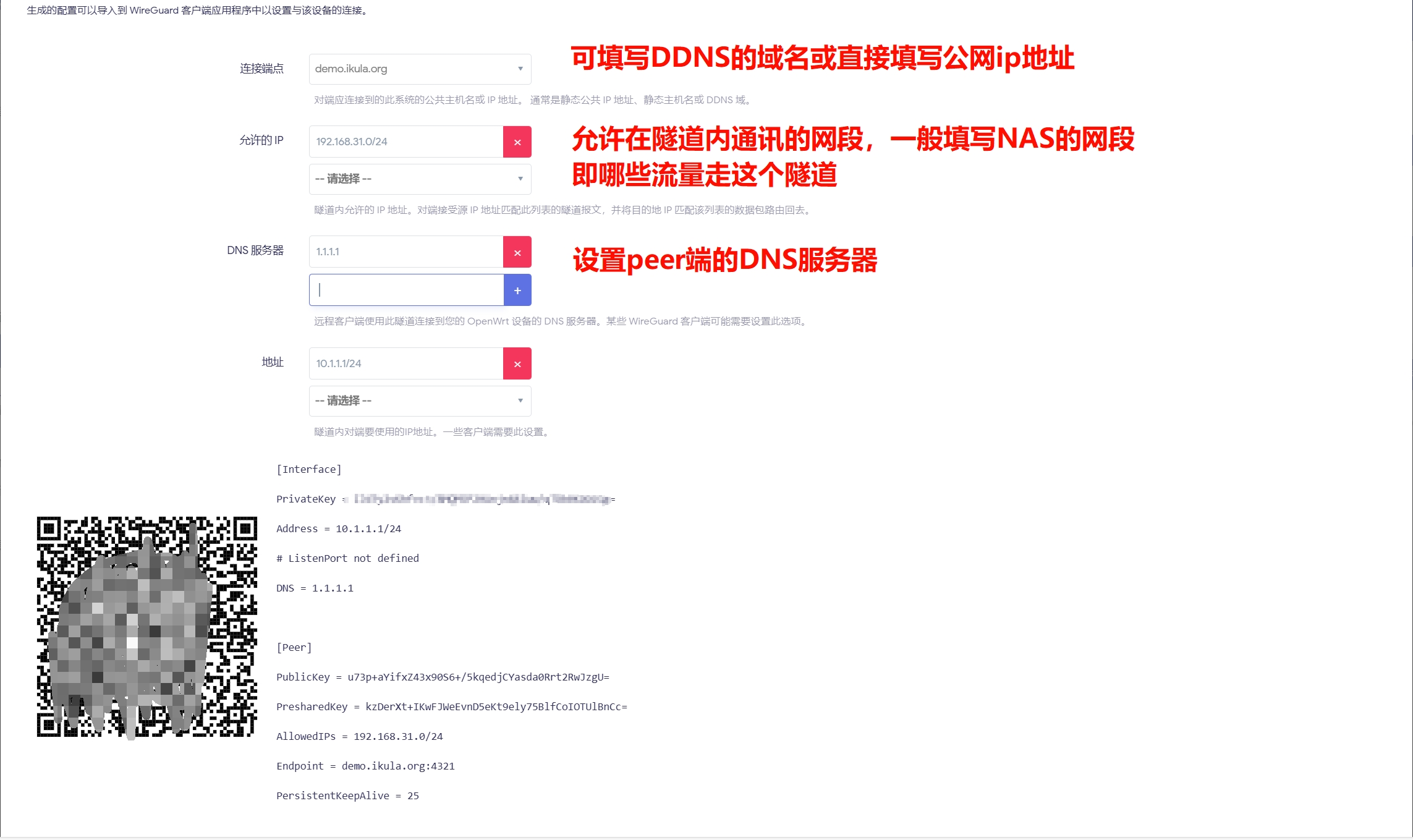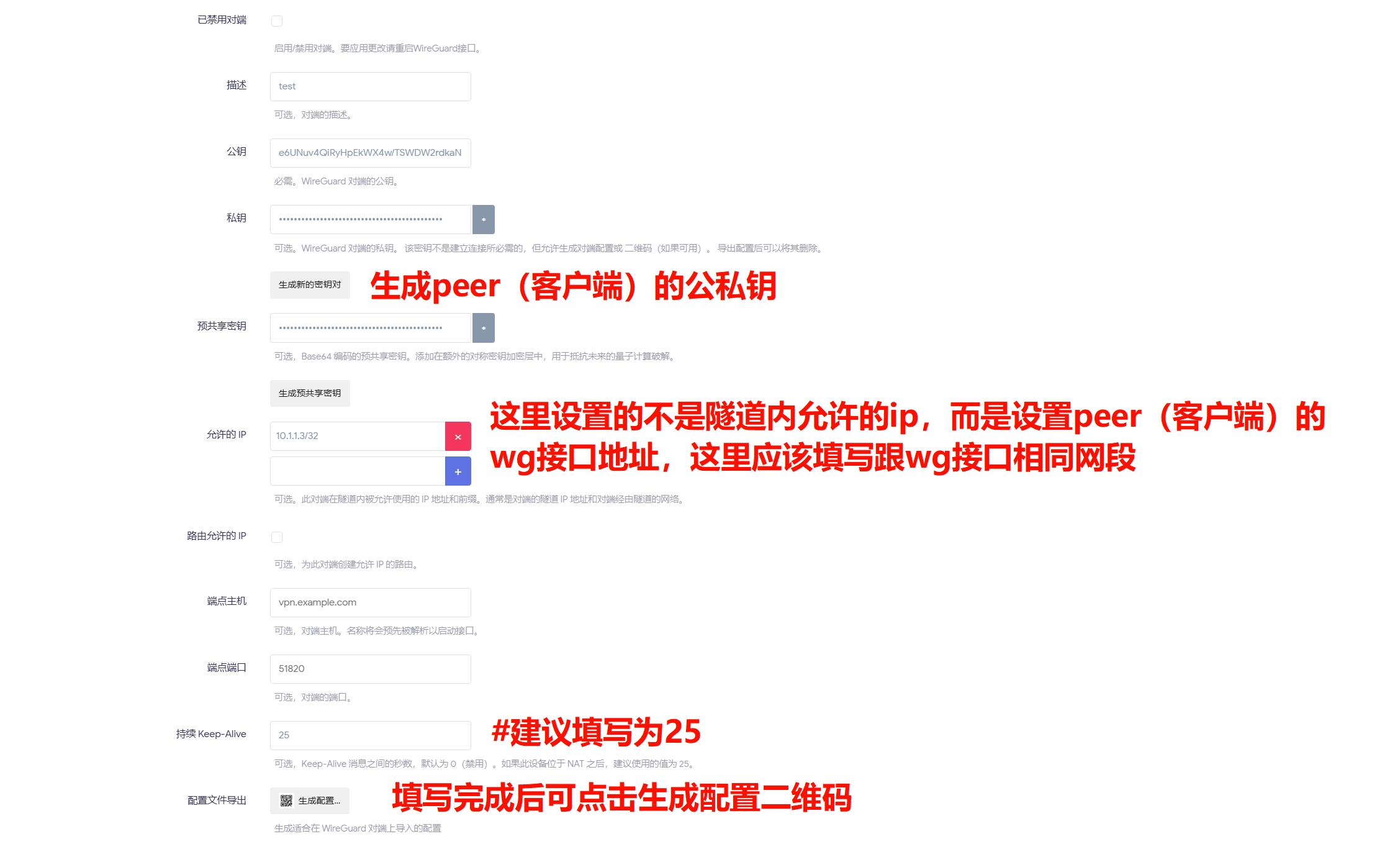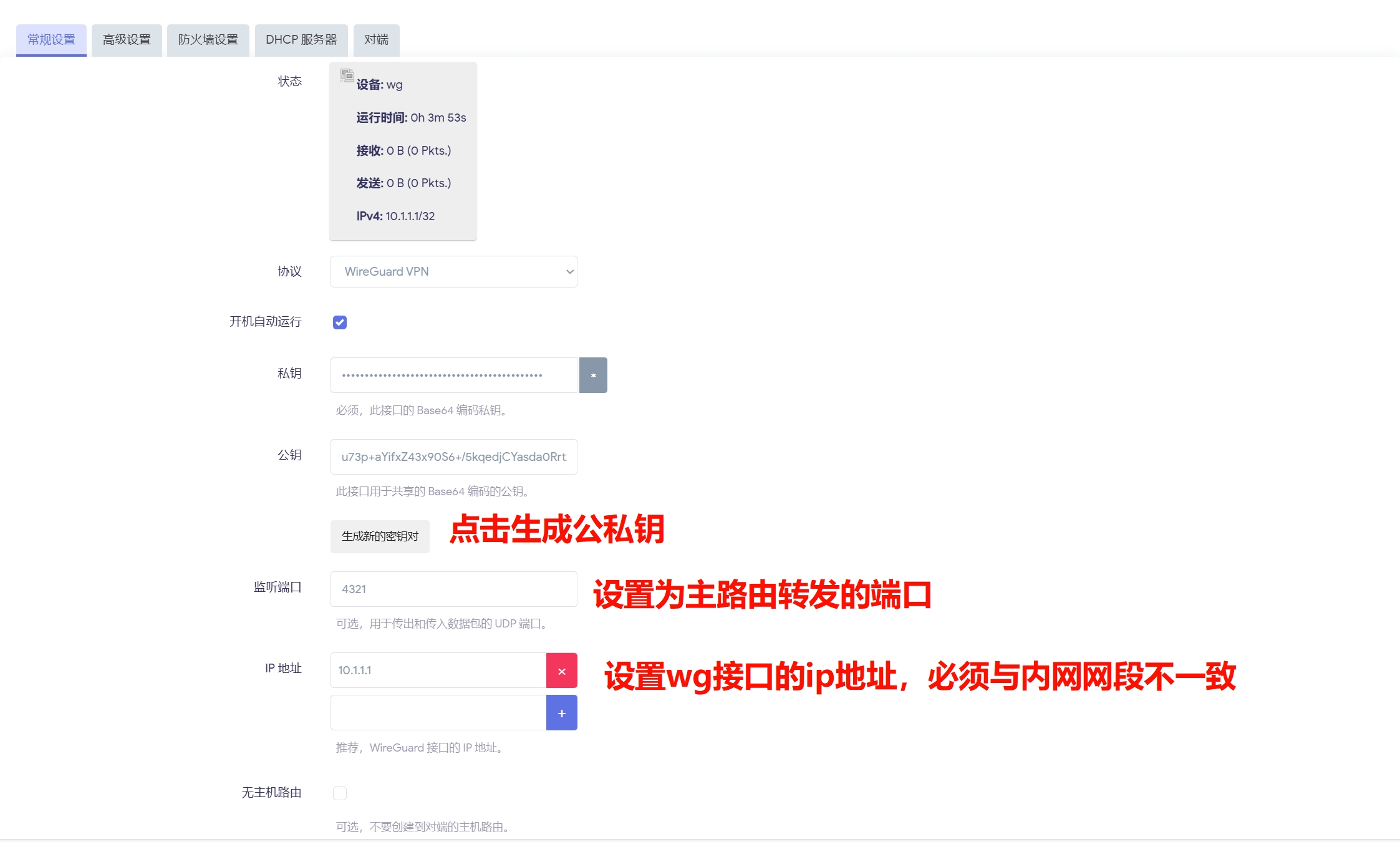 配置wireguard接口,点击生成公私钥,输入ip地址,以及监听的端口。防火墙规则设置为lan即可。(正确配置方式已重新写在末尾)