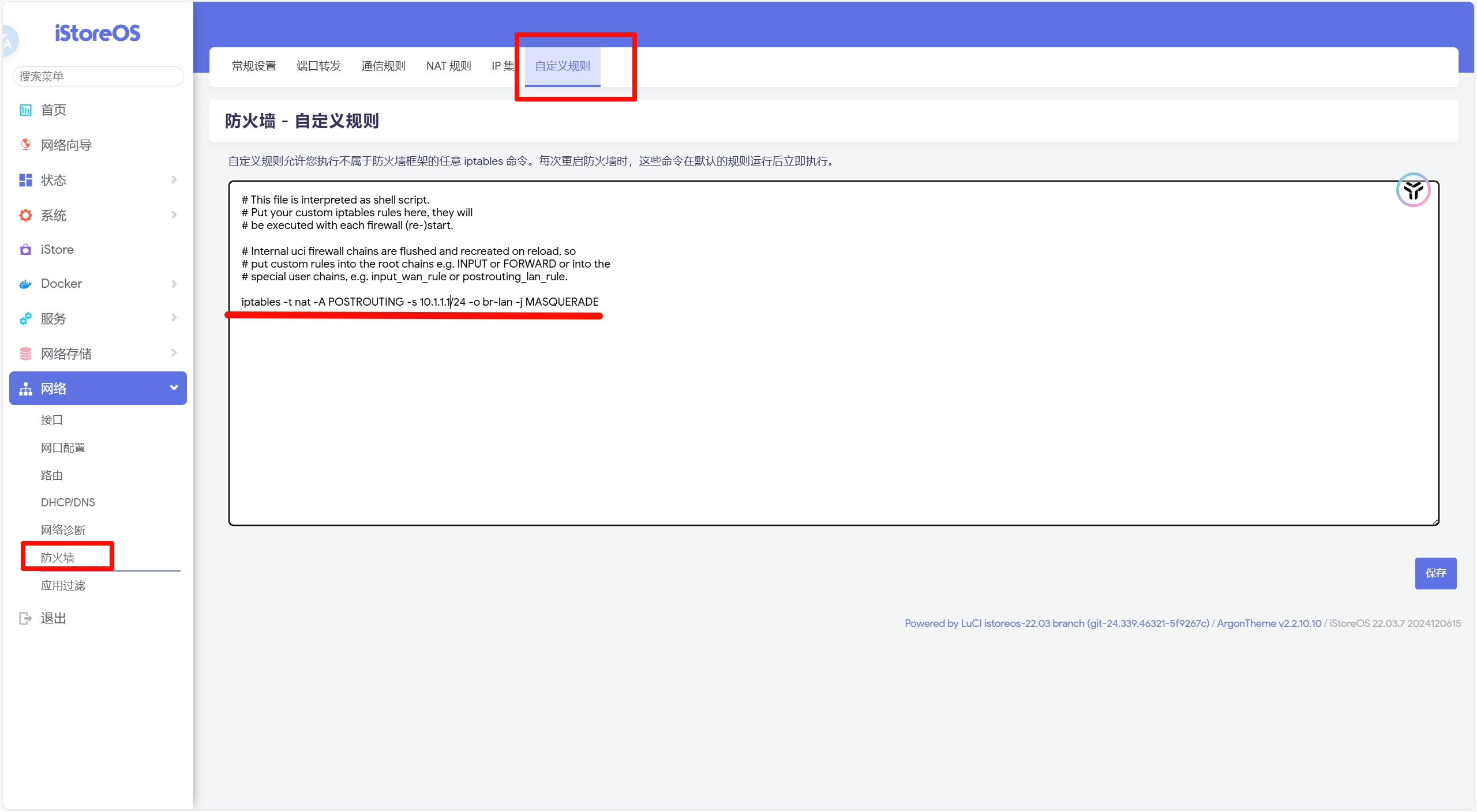 点击网络,选择防火墙,选择自定义规则,填写如下规则。填写完成后需要重启系统,让wireguard接口与防火墙规则生效。