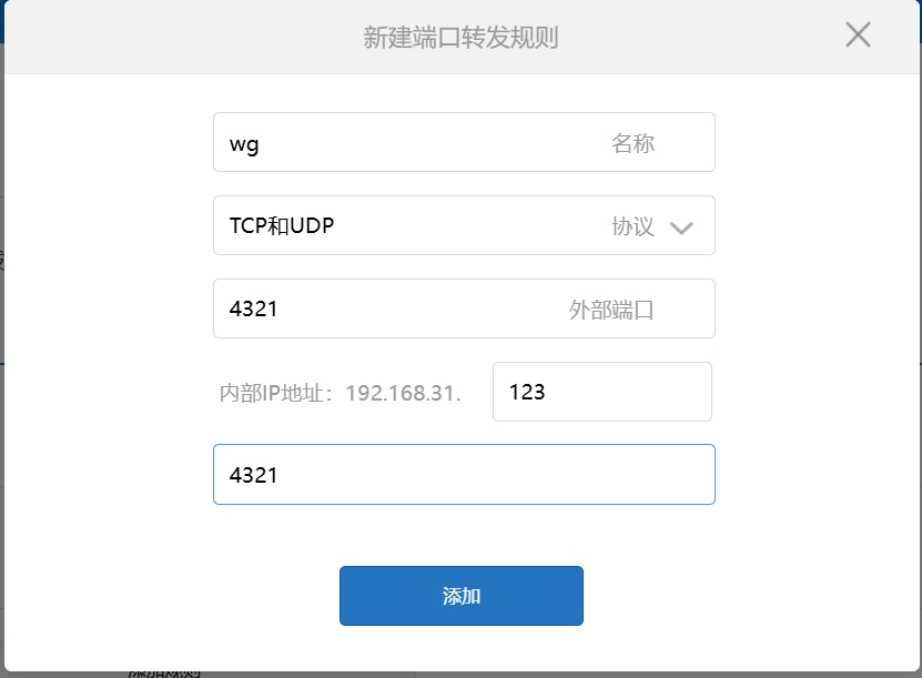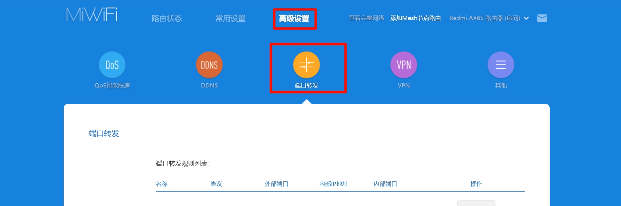 前面已经设置好了wg使用外部公网ip的4321端口作为数据传输接口,但iStoreOS作为旁路由的是作为一台内网的机器,所以还需要将公网的4321端口映射到iStoreOS上才能完成数据的传输,这里以Redmi AX6S硬路由举例。登录路由器管理后台,选择高级设置,端口转发。添加一条如下的规则。避免出现什么bug,协议建议选择TCP和UDP