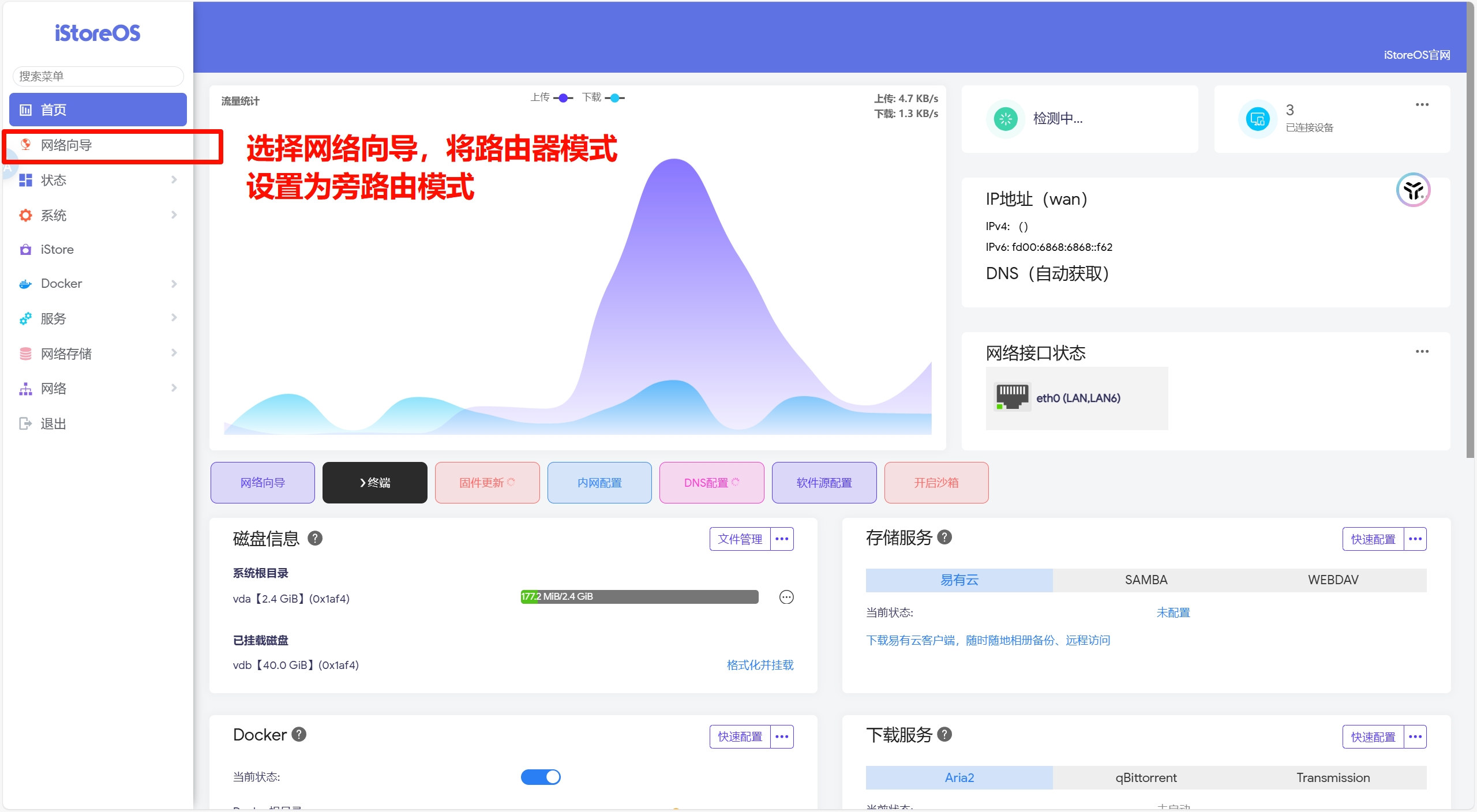 点击左侧的网络向导,使用手动模式,将路由模式设置为旁路由模式,并且DHCP服务关闭