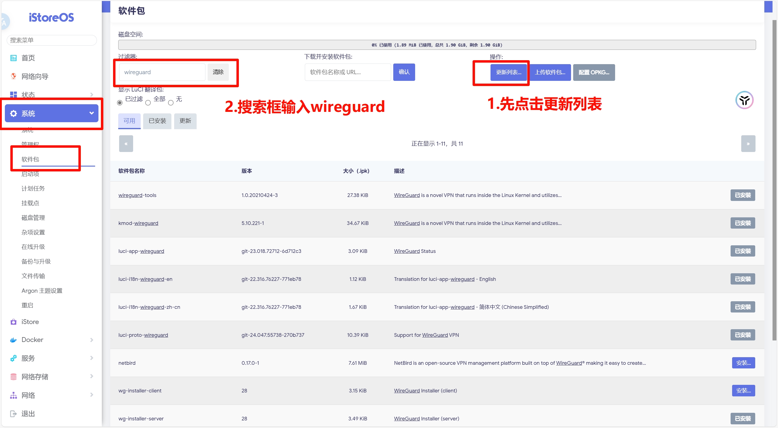 由于官方的iStoreOS默认是不带wireguard相关软件,所以需要手动安装