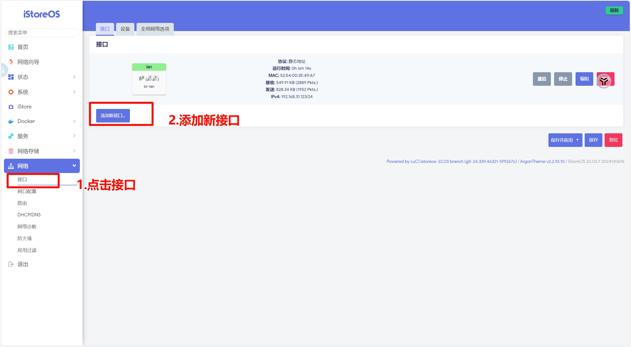 #进入终端后输入quickstart调出官方的初始化ip工具 #使用方向键控制选项,选择第二项,修改LAN口IP rooteiStoreOS:/# quickstart #这里可以输入qu后按TAB会自动补全命令 Use the arrow keys to navigate: ↓ ↑ → ← ? Console : ■ O Show Interfaces 1 Change LAN IP 3 Install x86 4 Reset q QUIT #选择第二项目后输入内网地址 rooteiStore0S:/# quickstart ■ Change LAN IP ■ IP:192.168.31.123 #本教程内网网段为 192.168.31.0/24 ■ MASK(eg. 255.255.255.0):255.255.255.0 #建议输入默认的子网掩码 #修改成功会输入reboot,重启使ip生效 |