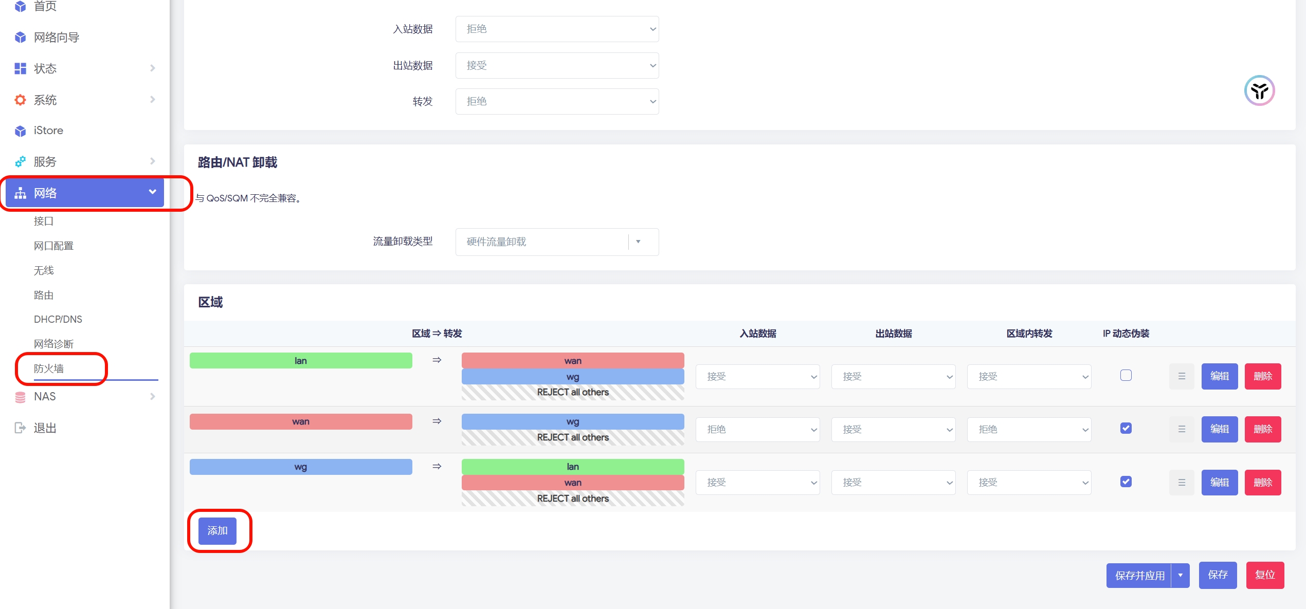 首先是来到网络—>防火墙—>区域,然后添加一个新的区域规则。