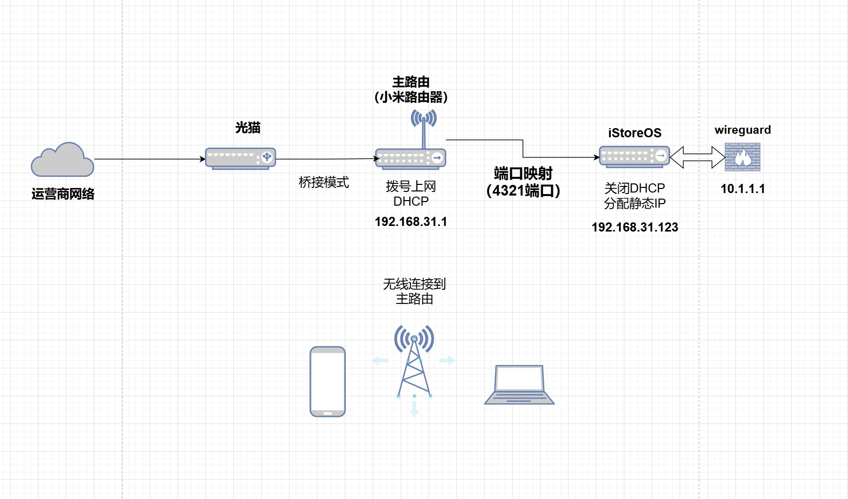 如图所示,本教程是将光猫设置为桥接模式,由主路由进行拨号上网,从而上主路由获取到公网ip,方便后续做端口映射。内网由主路由来进行DHCP服务。